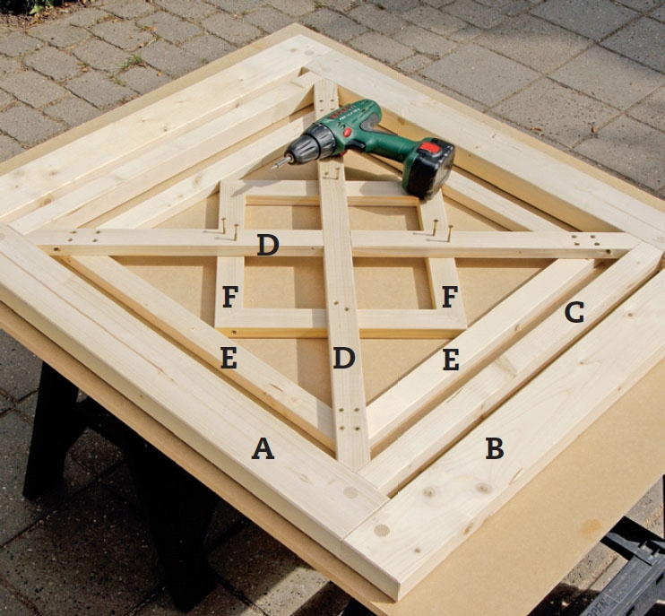 Læg de krydsende lister (D) op fra hjørne til hjørne. Marker midten, og mærk af, hvor enderne skal skæres til i snit på 45 grader, og sav ud. Læg listerne oven på hinanden, og tegn af, hvor samlingshakkene skal laves.