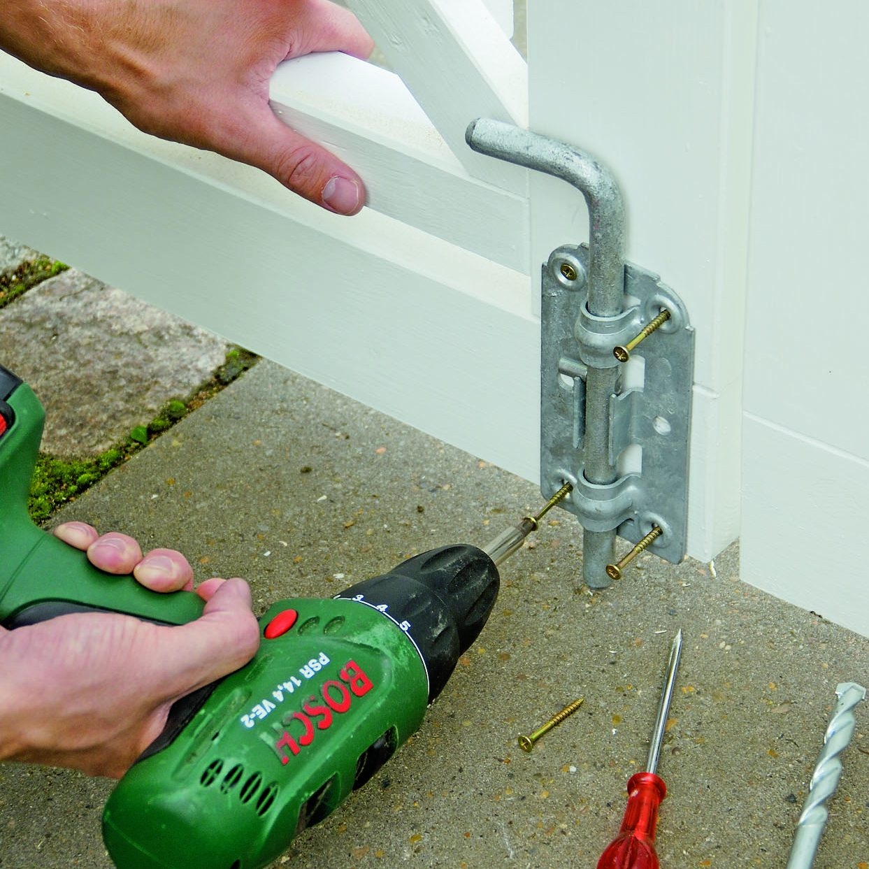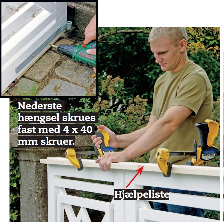 Når lågen sidder, som den skal, strammes tvingen omkring hængslet. Skru hængslet fast til lågen med 4 x 40 mm skruer.