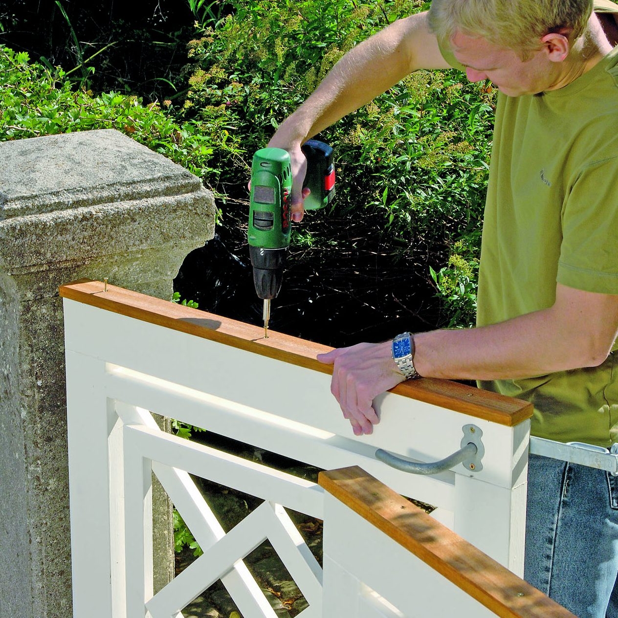 Sæt hængslerne på stablerne, og placer lågen, så den er 3 cm over fliserne. Læg en 25 mm tyk liste under til at sætte lågen på. Klods lågen op med kiler eller tynde pladestykker, indtil overkanten er vandret og siderne lodrette.