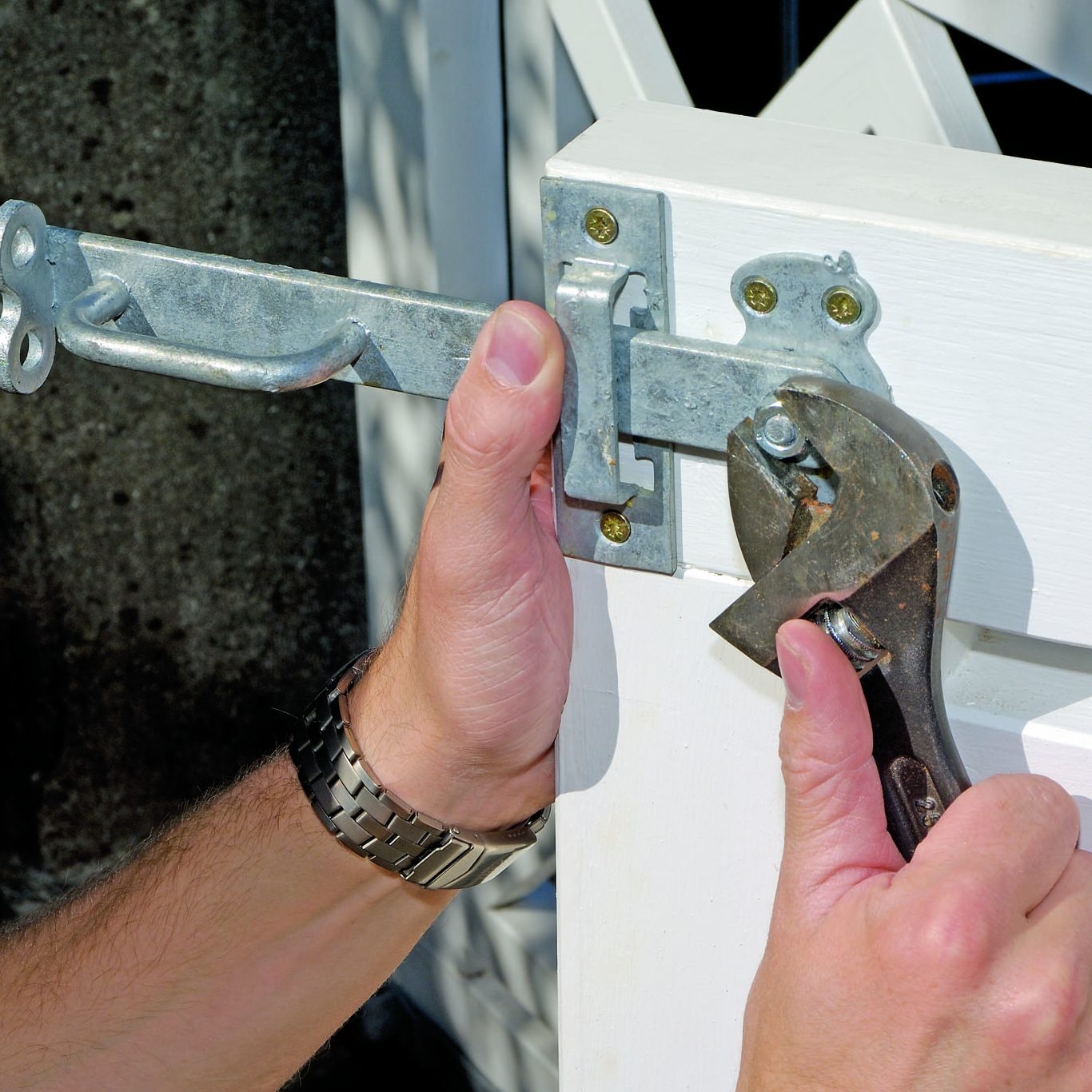 Skru krydset fast til rammen med 5 x 80 mm skruer. Her monteres skruen, så skruehullet vender vender skråt nedad - så bliver det ikke fyldt med regnvand.