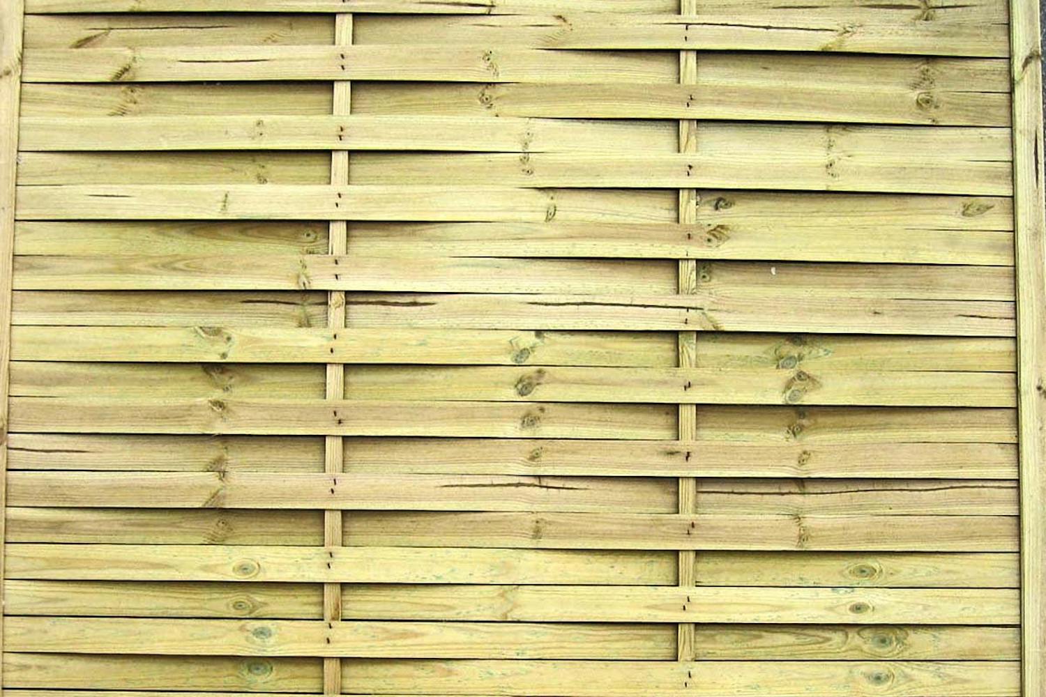 Et lamelhegn består af færdige fag, der monteres mellem stol per, enten med vin kel beslag eller ved at skrue fagene direkte fast til stolperne.