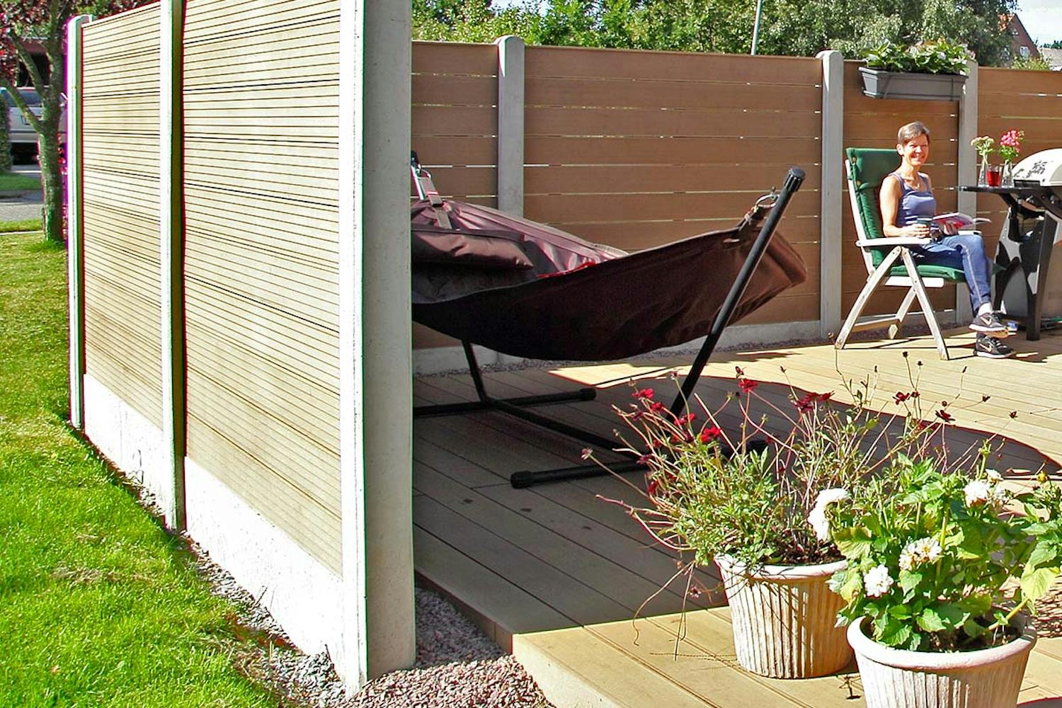 FORDELE: Et støjhegn kan sænke støjen med 5-6 dB, så du kan holde ud at sidde i en have, der vender ud mod en trafikeret vej. På indersiden ligner det et helt almindeligt hegn.
