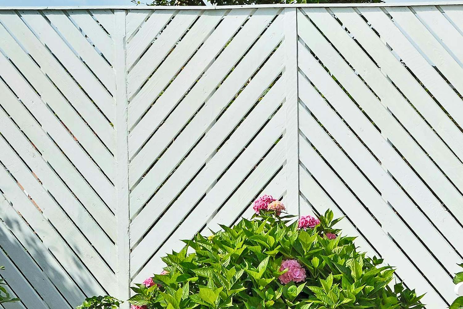 FORDELE: Når brædderne sidder på skrå, giver det mere afstivning til konstruktionen, så den bliver mere stabil. Højden og bredden er fleksibel og nem at tilpasse på denne type hegn. Det er let at udskifte et bræt, hvis der er behov for det.
