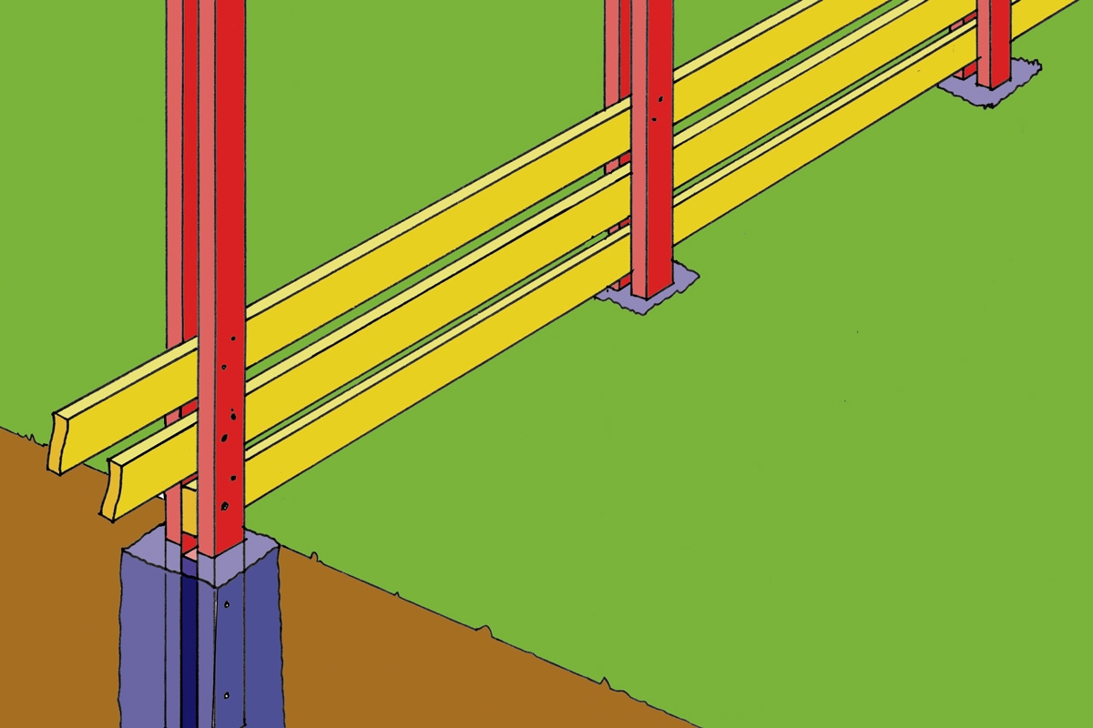 Til søjlerne bruger du 45 x 95 mm trykimprægnerede reglar. Du skal bruge 2 stk. pr. søjle, hvor de vandrette brædder placeres imellem. De vandrette brædders bredde og tykkelse bestemmer du selv; de skal blot være lange nok til at række over flere fag.