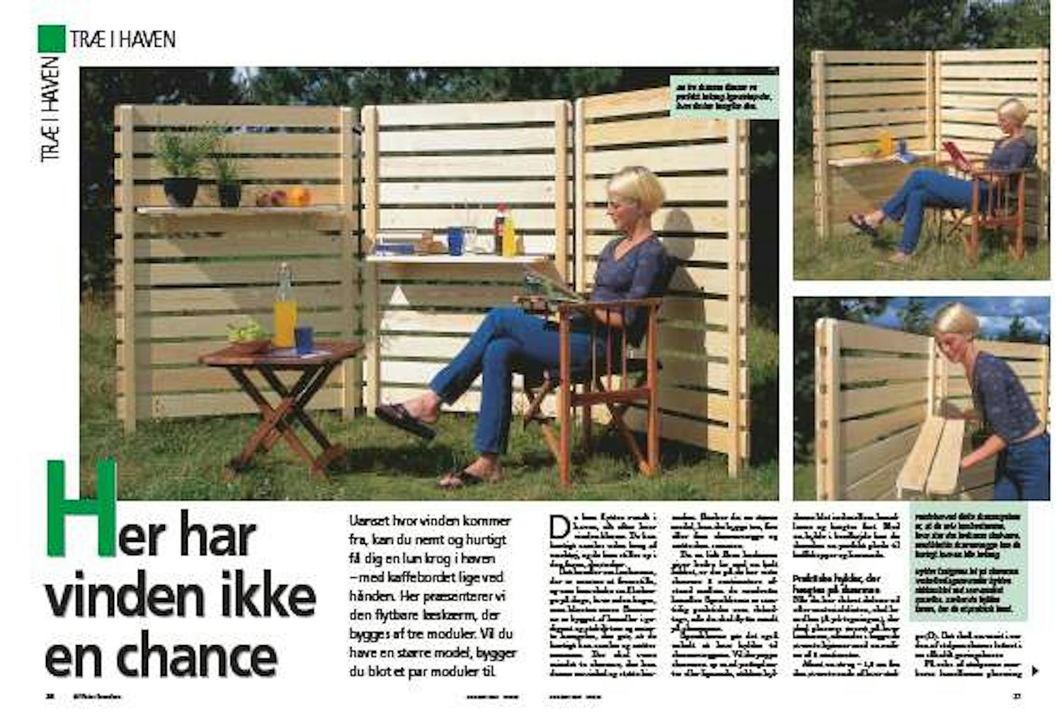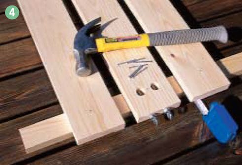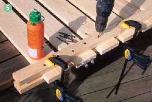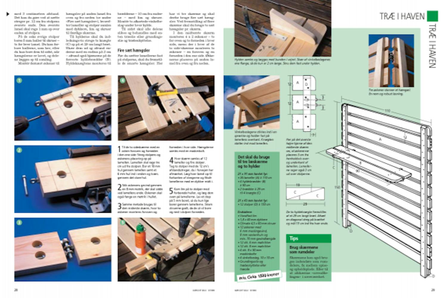Hver skærm samles af 12 lameller og fire stolper. Tag to stolper med de 12 cm’s afstandsstreger, du i forvejen har afmærket. Læg hver lamel op til forkanten af stregerne og fiksér lamellerne med en dykker midt i.