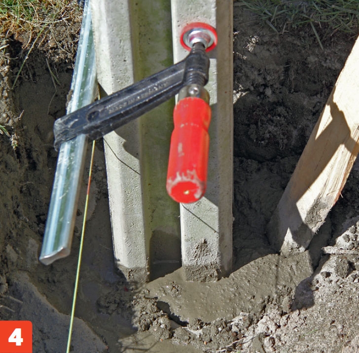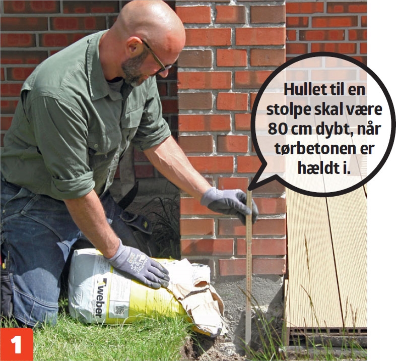 Stolperne er meget tunge, så vi er nødt til at være to om at placere dem korrekt. TIPS: Spænd to skruetvinger på stolpen. Så er den nemmere at håndtere.