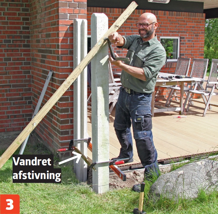 Mellem stolperne sætter vi betonplader. De sættes i et tykt lag grus og en posefuld tørbeton, så underkanten er under terræn og overkanten i vater. Pladen passer i rillen på stolperne.
