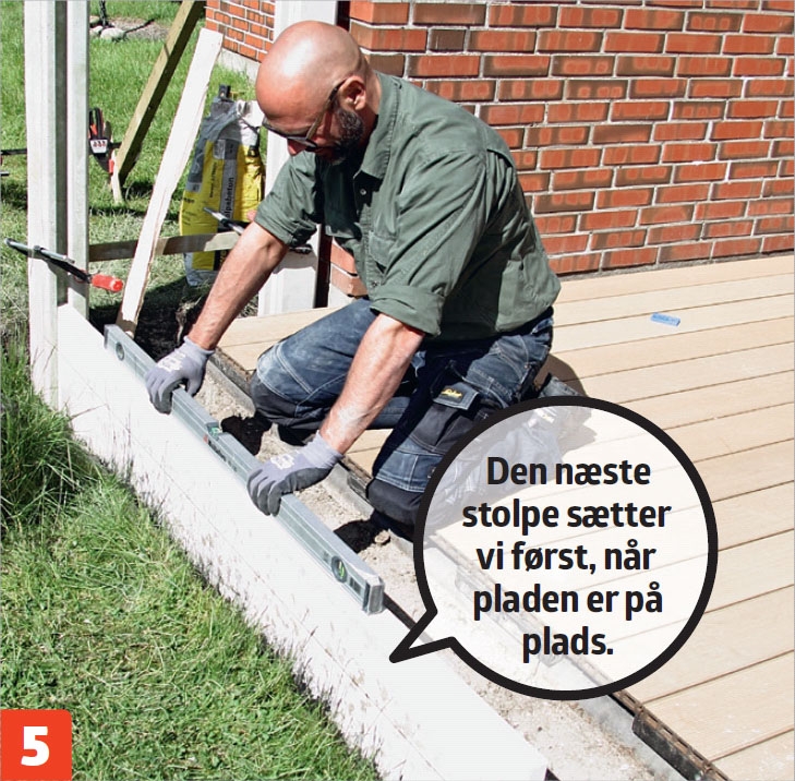 Mellem stolperne sætter vi kompositbrædder. De er lette at arbejde med og kan nemt skæres til i den rigtige længde. Og så skal de hverken grundes eller males, når vi er færdige med at bygge.