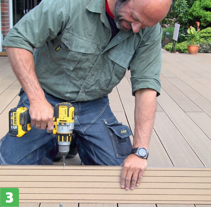 Kompositbrædder har rillet mønster på begge sider. Vi vælger at vende de breder riller udad og de smalle indad, fordi det passer til rillerne på terrassen.