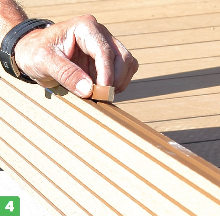 Mellem brædderne sætter vi tre små samle stykker af komposit (se tegning). De bliver delvist synlige, så de skal sidde præcist samme sted på alle brædder.