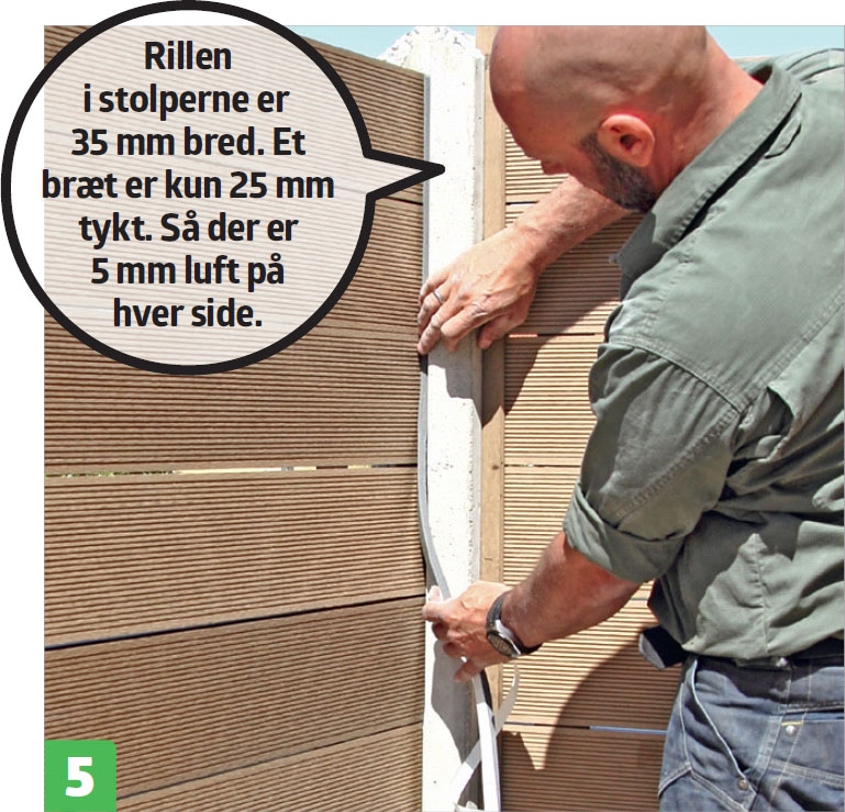 Det første bræt lægges midlertidigt på plads, så vi kan kontrollere, at der er cirka 5 mm luft mellem stolpe og bræt i begge ender. Det skal glide ned mellem rillerne.