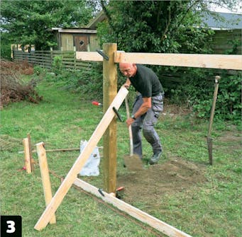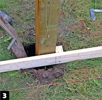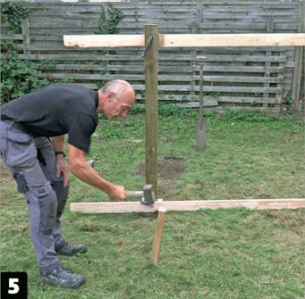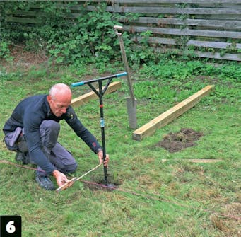 Mål op, hvor de øvrige stolper skal stå, og bank en pæl i jorden på det sted, hvor hver stolpe skal placeres. Ret pælene ind, så afstanden mellem snor og forkanten af stolpen er den samme som ved første stolpe.