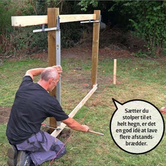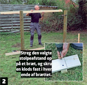Sæt afstandsbrædderne mellem stolperne, både foroven og forneden. Spænd det øverste bræt midlertidigt fast med skruetvinger.