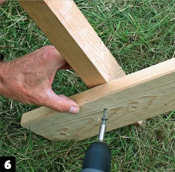 Ret stolperne ind, så de passer mellem klodserne på afstandsbrædderne. Spænd det nederste bræt fast med skruetvinger. Ret øverste afstandsbræt til, og spænd det fast med skruetvinger.