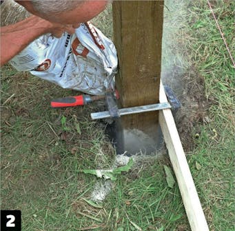 Stamp jord og beton med en lægte, så det hele pakker godt til omkring stolpen. Lad hjælpebrættet sidde, til betonen føles fast.