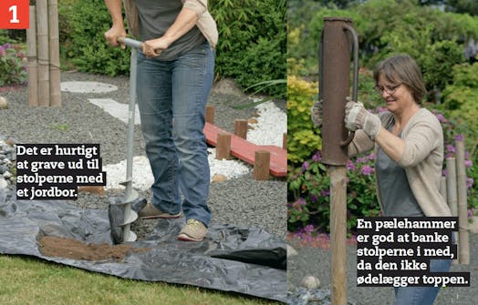 Find først ud af, hvor stolperne skal placeres. Det er lettest at bruge et jordbor til hullerne, men du kan selvfølgelig også grave ud til dem med en spade. Det er vigtigt, at stolperne kommer langt nok ned i jorden, 90 cm, så de står solidt, og frosten ikke risikerer at presse dem op igen. Bank så stolperne i jorden. Det er en rigtig god idé at bruge en pælehammer. Den ødelægger nemlig ikke toppen af stolpen, hvilket du nemt kan risikere, hvis du bruger en mukkert. Gør du alligevel det, så vær omhyggelig med at banke lige ned på toppen af stolpen.