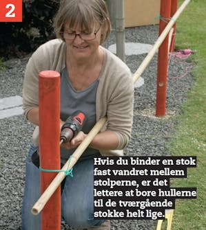Mål op til de tværgående bambusstokke, som skal sættes fast i huller i stolperne. Her sættes en murersnor fast på stolperne ca. 20 cm over jordoverfladen, hvor den nederste bambusstok skal være. Tjek med et snorvaterpas, at murersnoren er vandret, og mål så ud fra den, hvor de øvrige huller i stolperne skal placeres. Her er der 23 cm mellem de vandrette og lodrette stokke, så hegnet kommer til at danne et kvadratisk mønster. Men du kan placere stokkene præcis, som du vil, og lave det mønster, du har lyst til. Bor huller i stolperne med et spadebor. De skal være ca. 2 cm dybe. Det er vigtigt, at hullerne bores vandret ind i stolperne - så er det lettere at skubbe bambusstængerne på plads. Du kan evt. binde en hjælpestok fast midlertidigt til stolperne i vandret position, så du har noget at rette dig efter, når du borer.