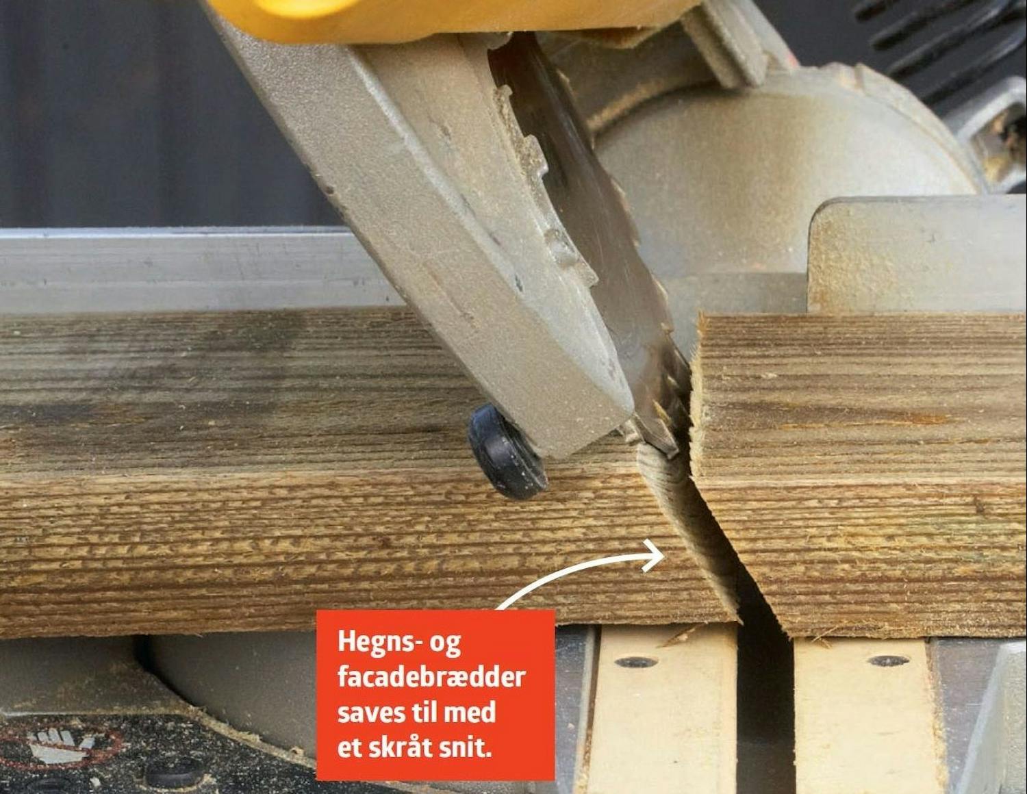 Også stolper kan du skære skrå foroven, hvis du synes, det er pænere end fx at montere en hætte. Lodrette beklædningsbrædder på et hegn eller en facade kan du også med fordel skære til med skrå snit, både foroven og forneden. Det samme gælder tværstivere på et hegn, hvor vandet også har bedre mulighed for at løbe af, hvis du laver skrå snit både på over- og underside. En skarp kant forneden på et bræt bevirker, at vandet lettere drypper af, da det ikke kan samles på samme måde som på en retvinklet kant.