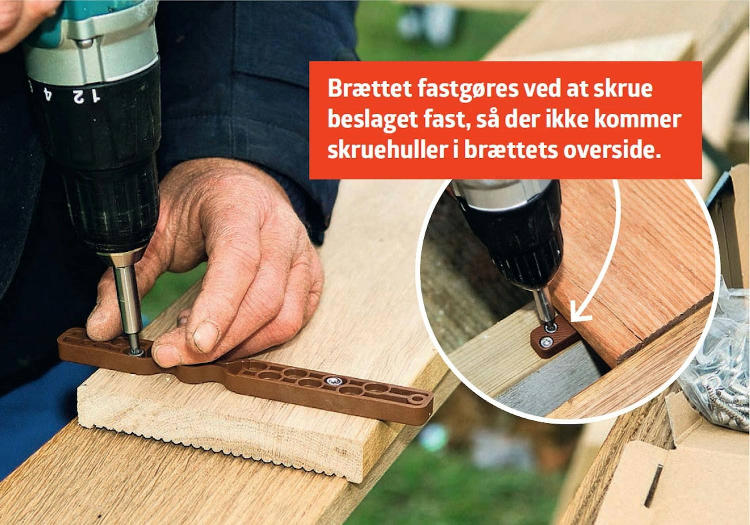 Beslaget fastgøres på undersiden, vendes rundt og skrues så fast til underliggende strøer i den lille del af beslaget, der stikker uden for brættet.