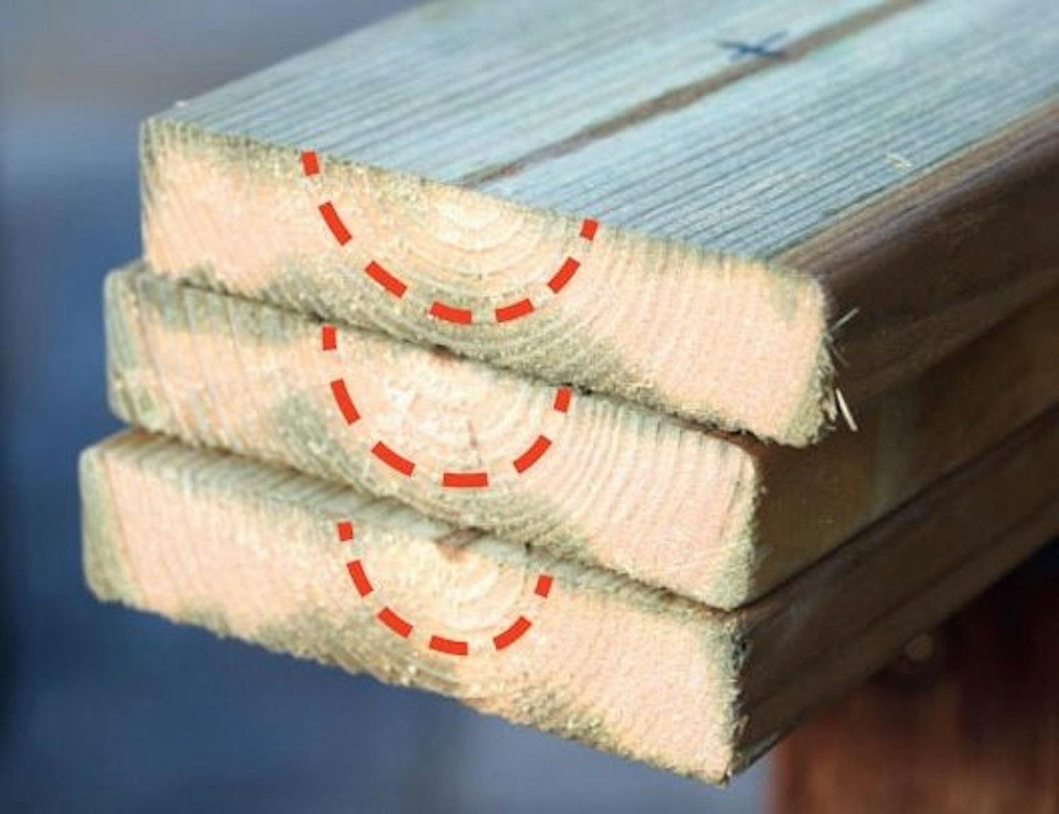 Du kan tjekke, hvilken side der er marvsiden, ved at kigge på enden af brættet. Når årringene “smiler”, vender marv-siden opad.