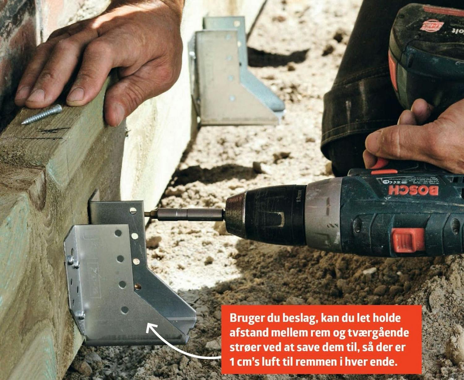 De helt tætte samlinger har den ulempe, at de godt kan ende som fugtfælder, fordi vandet samles her og ikke kan komme væk. Bruger du beslag, kan du fx skære de underliggende strøer til en terrasse lidt kortere end afstanden mellem remmene, så der er luft, og vandet hurtigt kan løbe væk. Knap 1 cm i begge sider er passende.