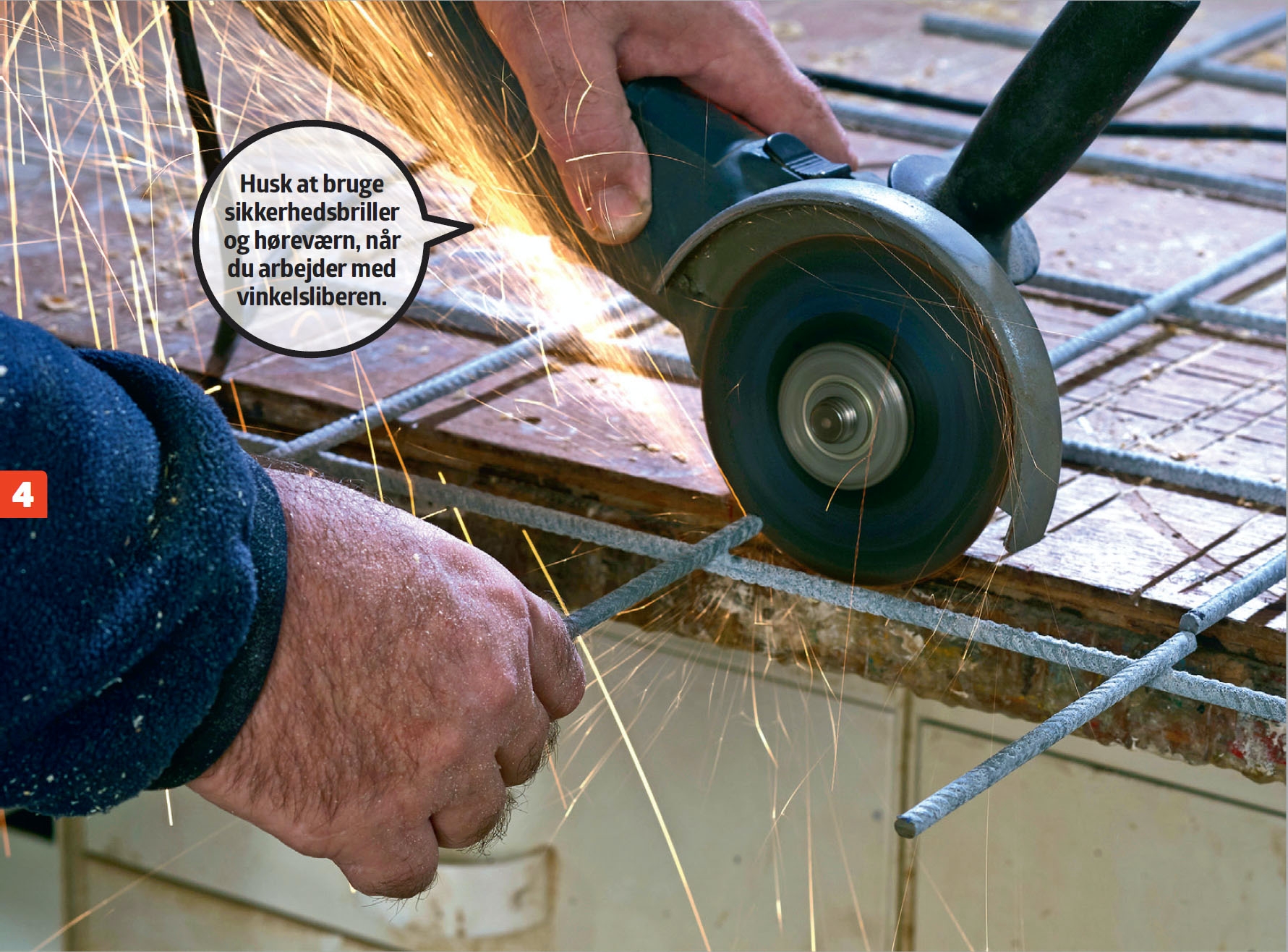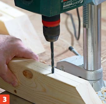 Bor hullerne. Der bores 4 cm ned i træet. For at hullerne bliver helt lige, anbefaler vi, at du bruger en søjleboremaskine eller en boresøjle til opgaven.