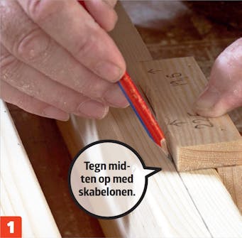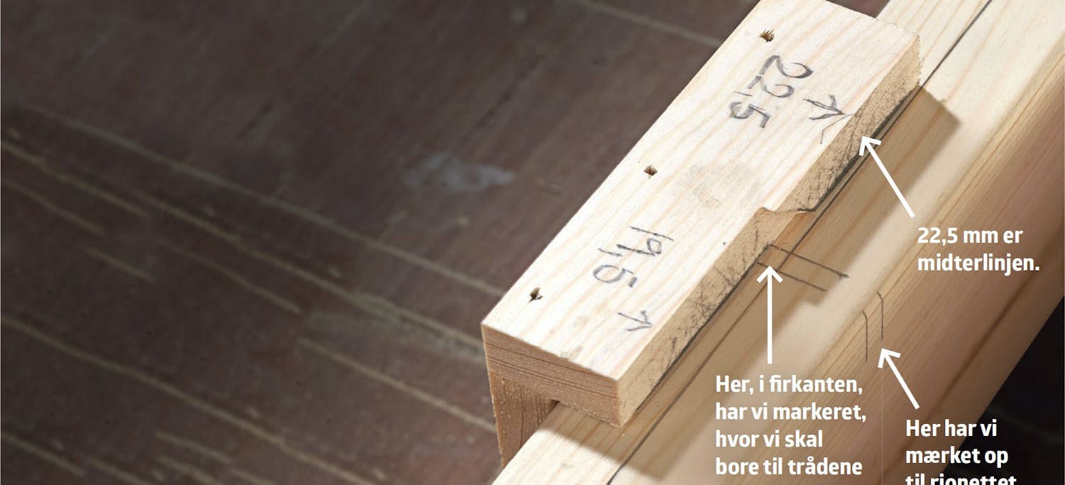 Mærk op til nettet på indersiden. Tidligere tegnede vi op til rionettet på træets brede side. Nu flytter vi det mål til indersiden, hvor vi skal bore. Brug en tømmervinkel.