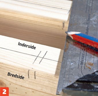 Brug et bræt som lineal. For at få så præcise snit og dermed så præcise samlinger som muligt streger vi op efter et bræt, der er savet af på 45 grader.