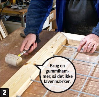 Fiksér samlingerne med en skruetvinge. Så er du sikker på, de er helt præcise. Skru 2 stk. 5 x 100 mm skruer i hvert hjørne. Spænd dem så hårdt, at limen pibler ud i samlingerne.