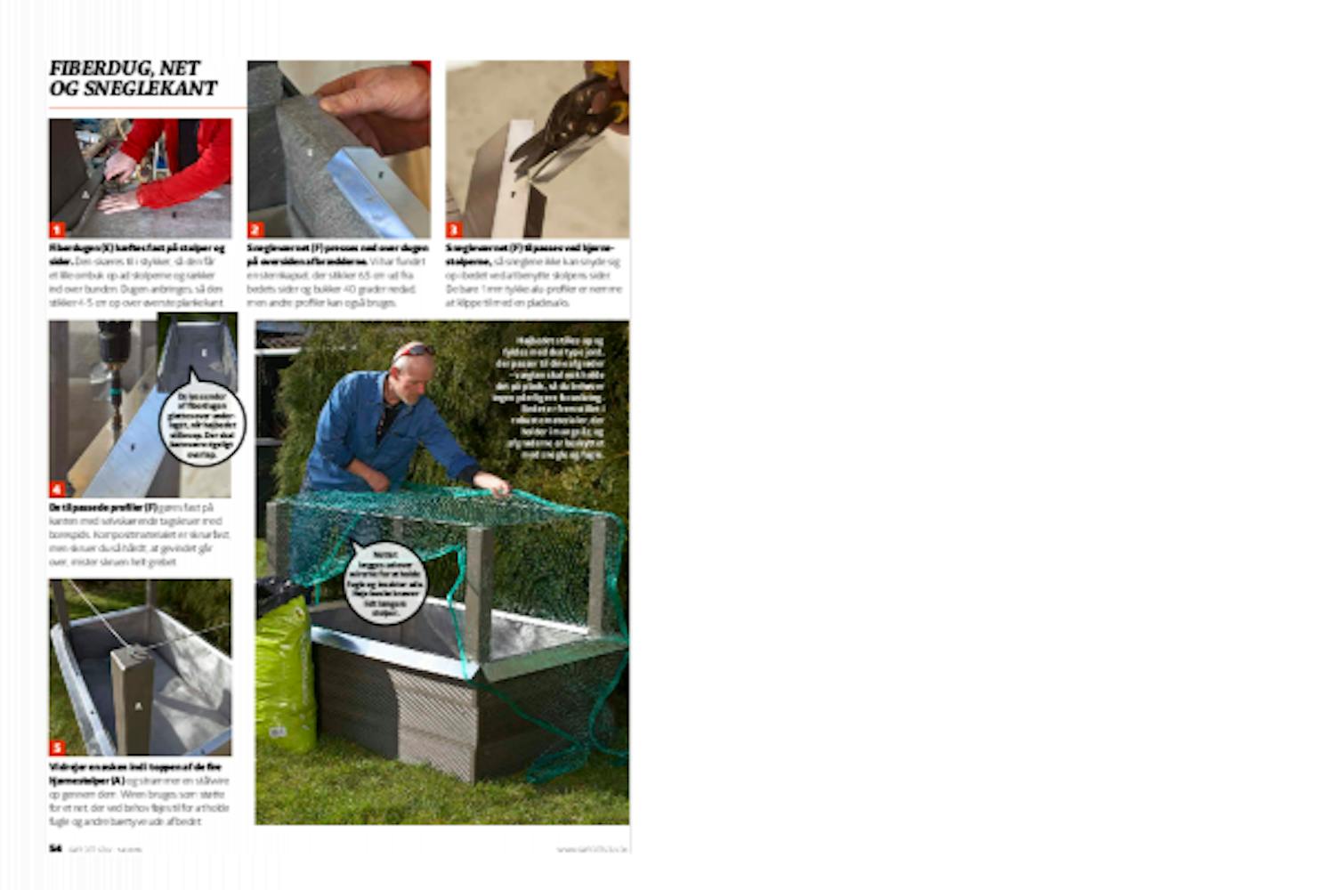 Snegleværnet (F) presses ned over dugen på oversiden af brædderne. Vi har fundet en sternkapsel, der stikker 6,5 cm ud fra bedets sider og bukker 40 grader nedad, men andre profiler kan også bruges.