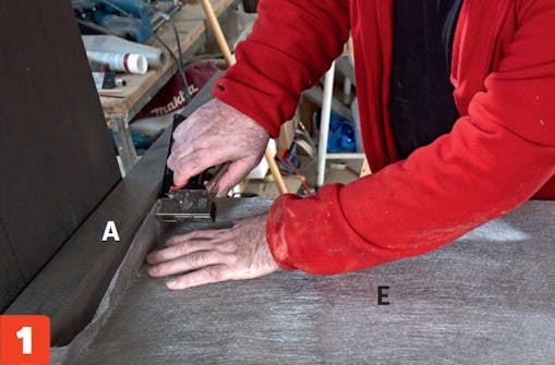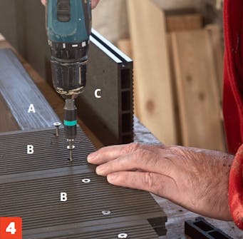 Bor for til skruer på brædderne (B og C). For at få skruerne i snorlige rækker midt på hjørnestolpen laver vi en boreskabelon. Fletteteknikken gør, at skruerne sættes i forskellig afstand i hver ende af plankerne.