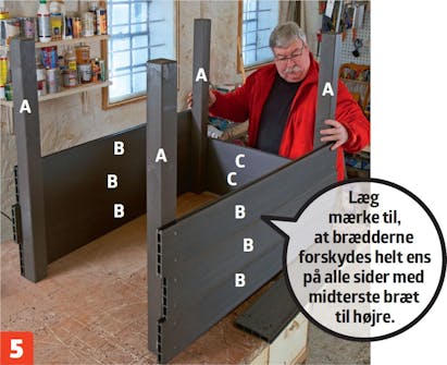 Vi samler brædderne (B) til langsiderne med 5 x 50 mm rustfri skruer. De flettes, så hvert andet bræt hhv. flugter med stolpens side eller stikker en planketykkelse - her 25 mm - ud fra stolpens kant.