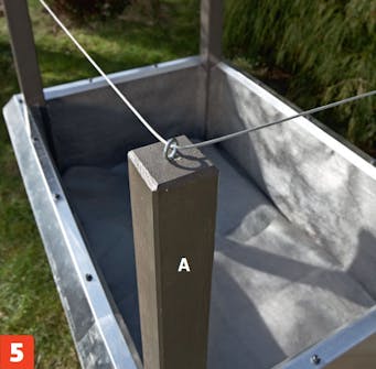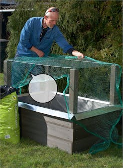 Vi drejer en øsken ind i toppen af de fire hjørnestolper (A) og strammer en stålwire op gennem dem. Wiren bruges som støtte for et net, der ved behov føjes til for at holde fugle og andre bærtyve ude af bedet.