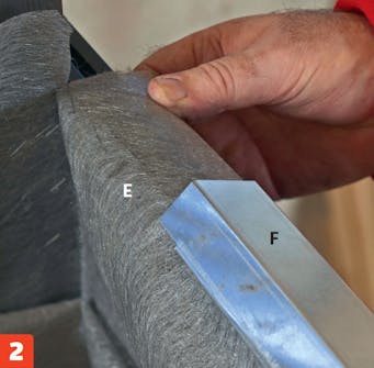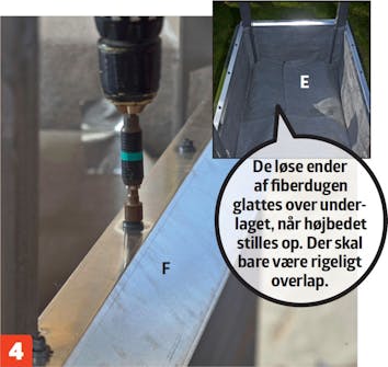 Fiberdugen (E) hæftes fast på stolper og sider. Den skæres til i stykker, så den får et lille ombuk op ad stolperne og rækker ind over bunden. Dugen anbringes, så den stikker 4-5 cm op over øverste plankekant.