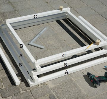 Højbedets skelet bygges op af lægter, som skrues sammen oven på hinanden med 5,0 x 70 mm skruer. Du begynder med at samle toprammen - som herefter lægges ned - og den bliver på den led en slags bund i en pyramideform.