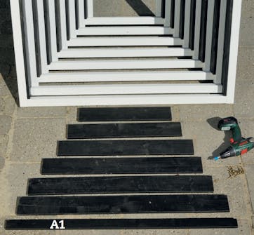 To sider mangler nu beklædning. Læg beklædningsbrædderne klar som før. Denne gang startes øverst med (A1), så overkanten bliver ens hele vejen rundt.