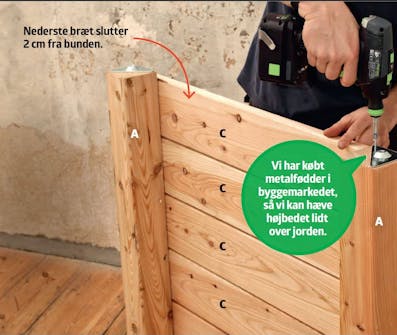 Montér alle brædder (C). Gør dig umage med at sikre, at brædderne skrues helt lige på. Hvis du vil have skruerne i plan med træet, skal de undersænkes.