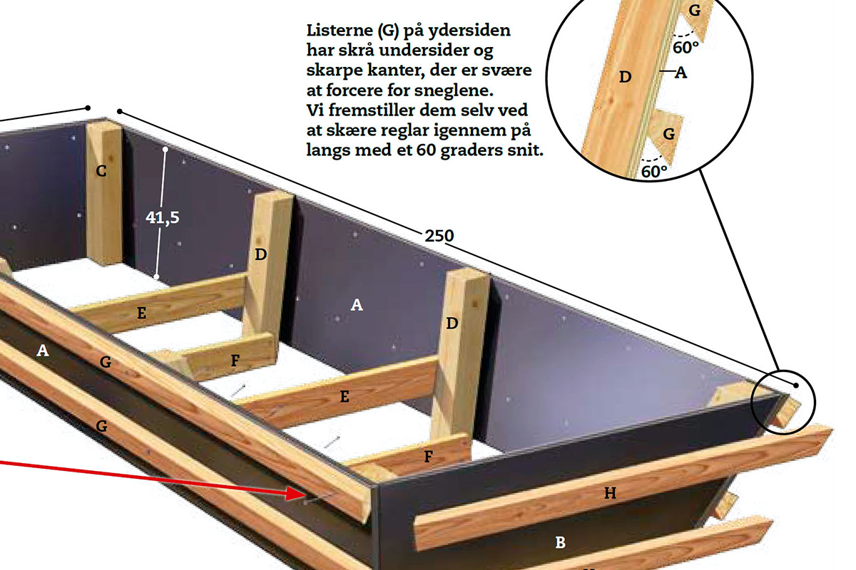 Sidste led i afstivningen af bedets lange sider er de udvendige lister (G og H). Det er dem, vi med enkle midler gør til en barriere, som snegle ikke kommer forbi - men det er faktisk bare en sidegevinst.