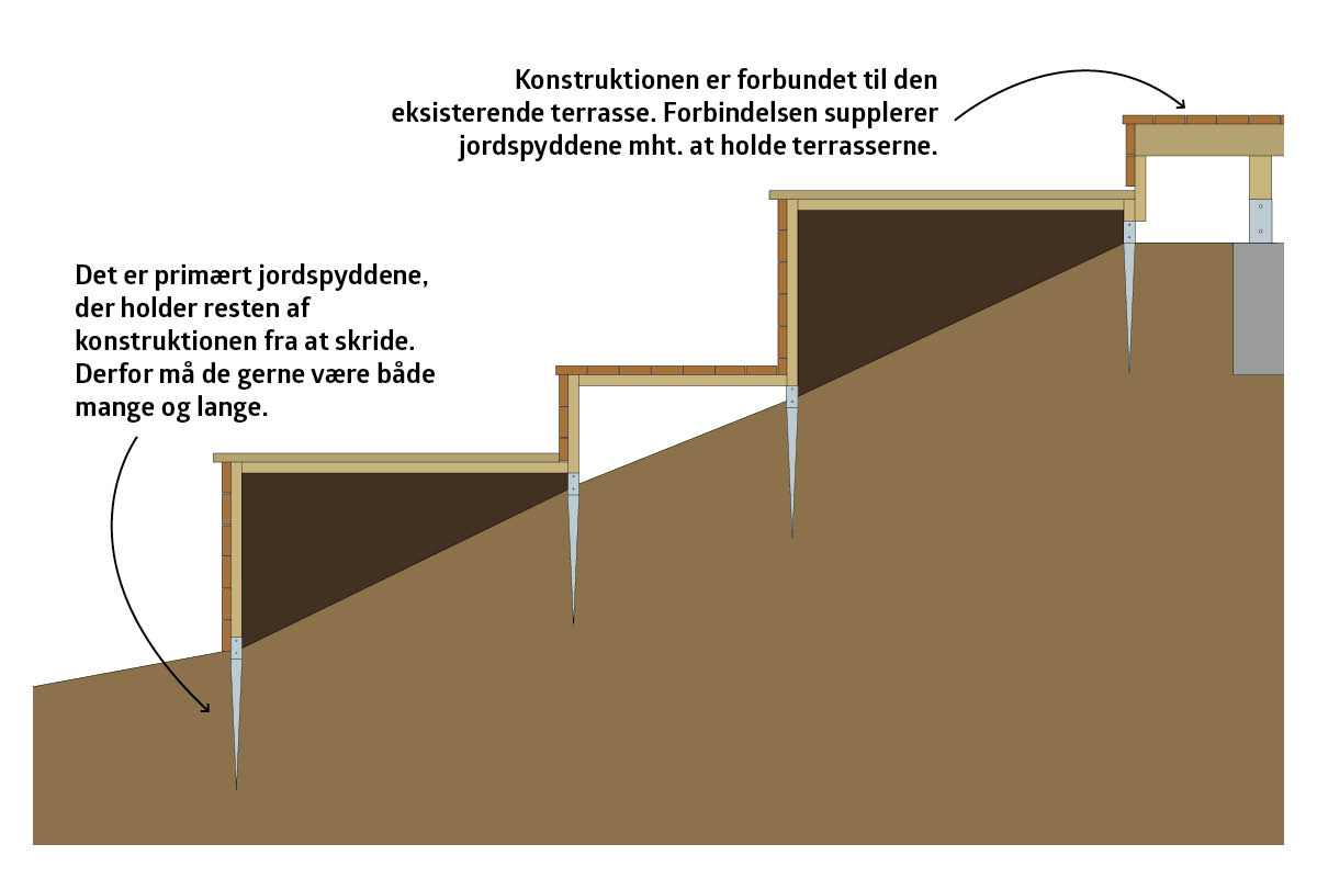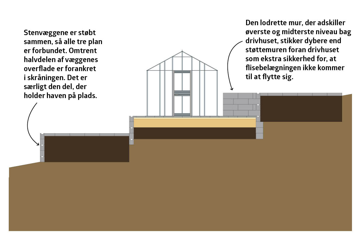 I stedet for at bruge krudt på støttemure er anlægget her bygget på stolper, der er forankret med jordspyd. Fordelen er, at skråningen holder sig selv, og trækonstruktionerne skal udelukkende holde den vægt, der fyldes på, fx i form af jord eller drivhuse. Desuden var der allerede en træterrasse på huset, som var oplagt at udvide ned ad skråningen.