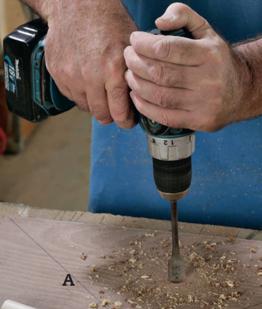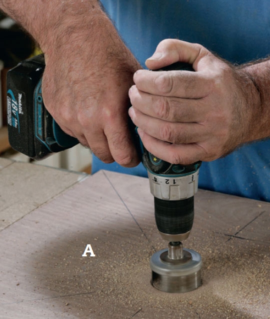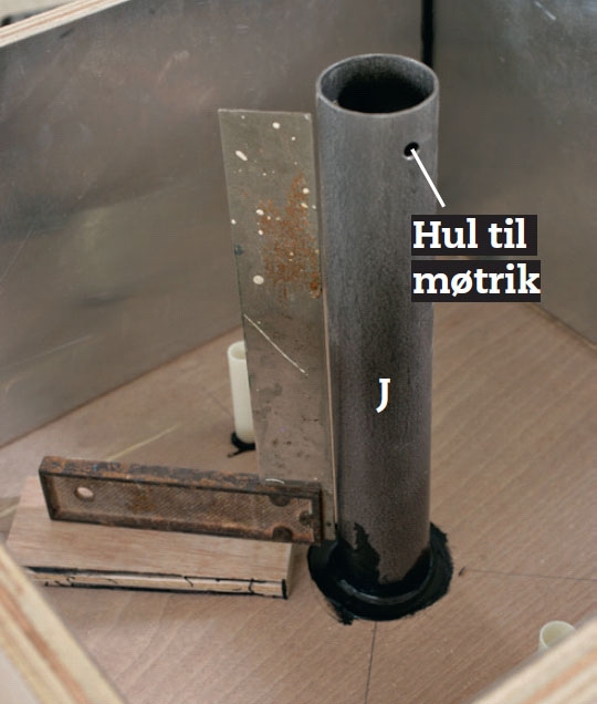 Midt i bunden (A) borer vi hul til rørholderen (J). Vores rør er 50 mm i diameter, og vi borer med et 52 mm kopbor.