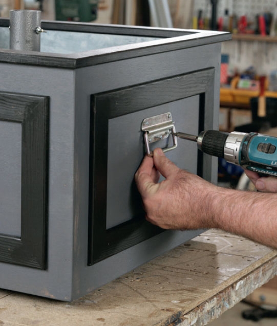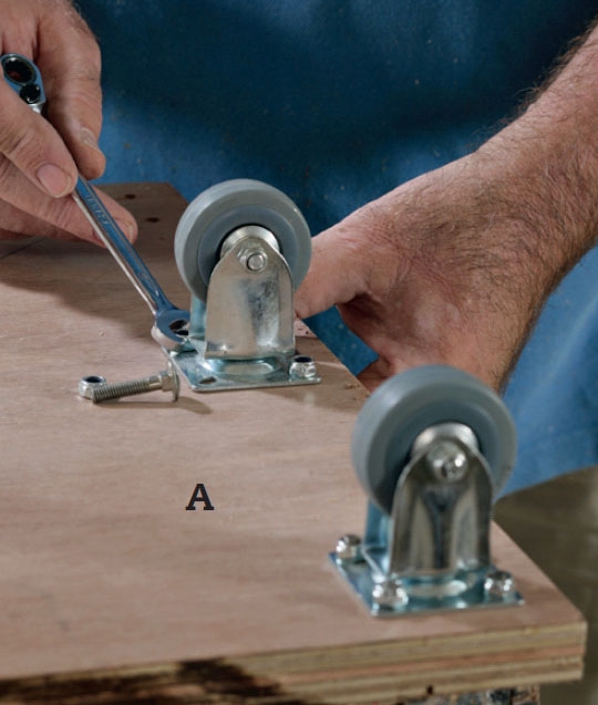 Hjulene gøres fast på en række i bundens ene side. Mærk op gennem hullerne i hjulene, og bor helt igennem bunden med et 6,5 mm bor. Hvert hjul gøres fast med fire bræddebolte og møtrikker.