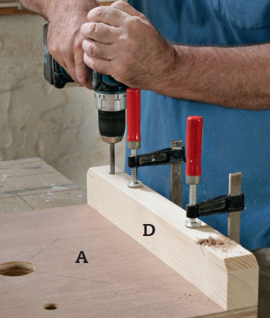 Foden (D) spændes fast på undersiden af bunden, og så borer vi med et 10 mm bor for til to lange bræddebolte. Foden skæres til, så den sammen med hovedet på boltene har samme højde som hjulene.