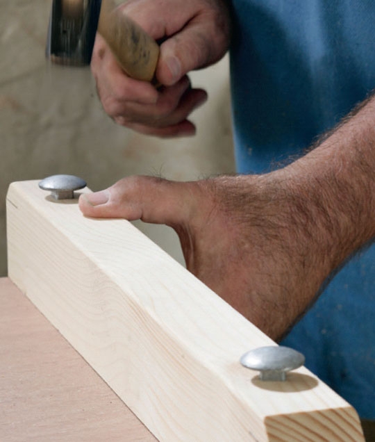 Bræddeboltene stikkes gennem foden (D) og slås ned, så kanterne på halsen tager fat. Møtrikkerne spændes på i den anden ende. Boltenes hoved sikrer, at foden ikke står nede på terrassens fugt.