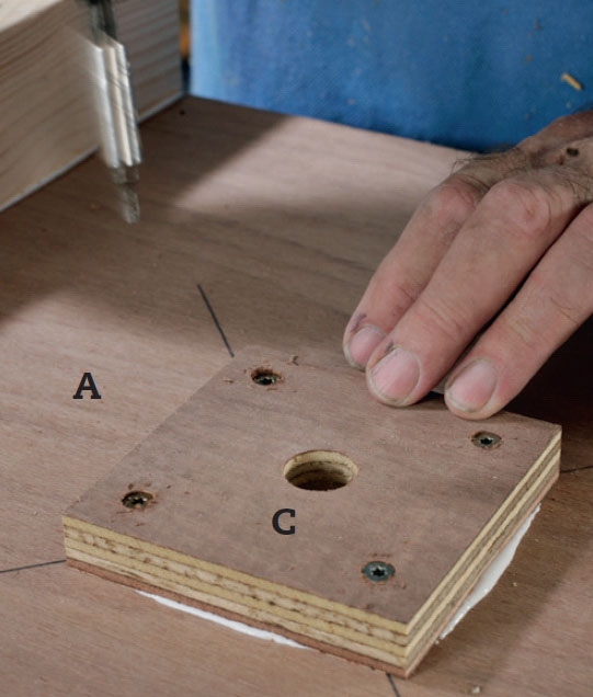 Støtteklodsen (C) skrues på bundens underside med en stribe lim. Den sættes midt over hullet til rørholderen, og midt i klodsen borer vi et 20 mm drænhul.