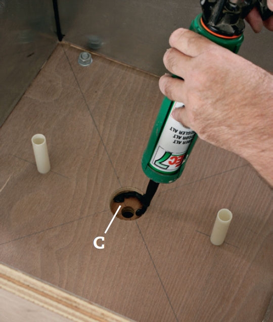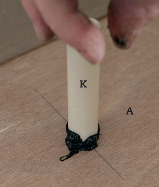 Vi lægger klæber rundt i kanten af hullet midt i bunden (A) og også nede på støtteklodsen (C), der skal bære vores rørholder (J).