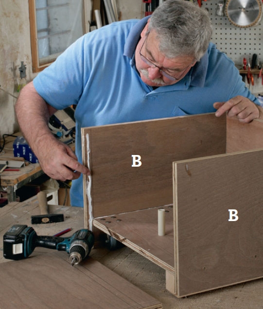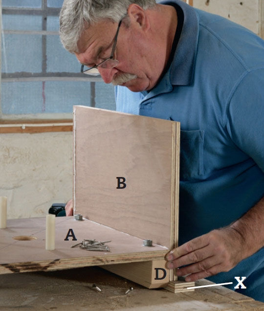 Den første side (B) gør vi fast til bunden (A) på den side, hvor foden (D) sidder. Den skal gå 5 cm ned over bunden, vi støtter med en klods (X) under arbejdet. Vi gør siden fast med lim og 4 x 50 mm skruer.