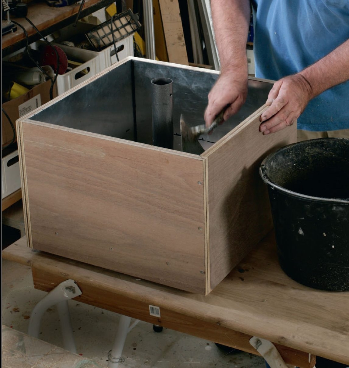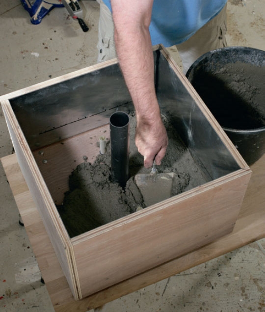 Så fylder vi beton op til stregerne på zinken. Slå evt. med en gummihammer på kassens sider, så betonen vibreres og lægger sig tæt mod røret og siderne. Betonen røres op, så den er temmelig fast.