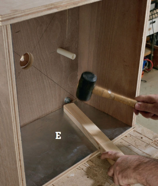 Pres zinkpladerne (E) ned i klæbemassen, og slå dem plant ud med en hammer - naturligvis med en bred klods til at fordele slaget, så du ikke buler den fine zinkplade.