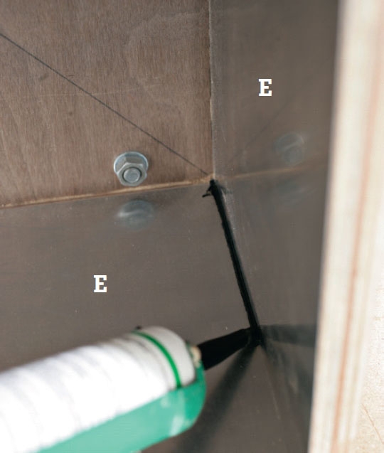 Kassens indvendige sider tætner vi med zinkplader, som vi har bedt den lokale VVS’er om at klippe på mål. Vi har blot fået skåret de plane pladestykker på mål, så tætner vi med en klæbe-/ fugemasse i hjørnerne.