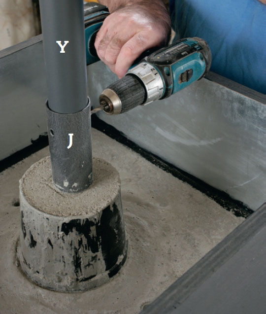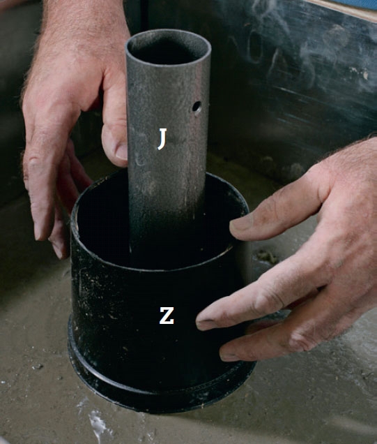 Omkring rørholderen (J) støber vi højere op. Til at holde på betonen bruger vi en urtepotte af plast (Z), som vi har skåret bunden ud af. Potten trykkes i første omgang bare lidt ned i den fugtige beton.